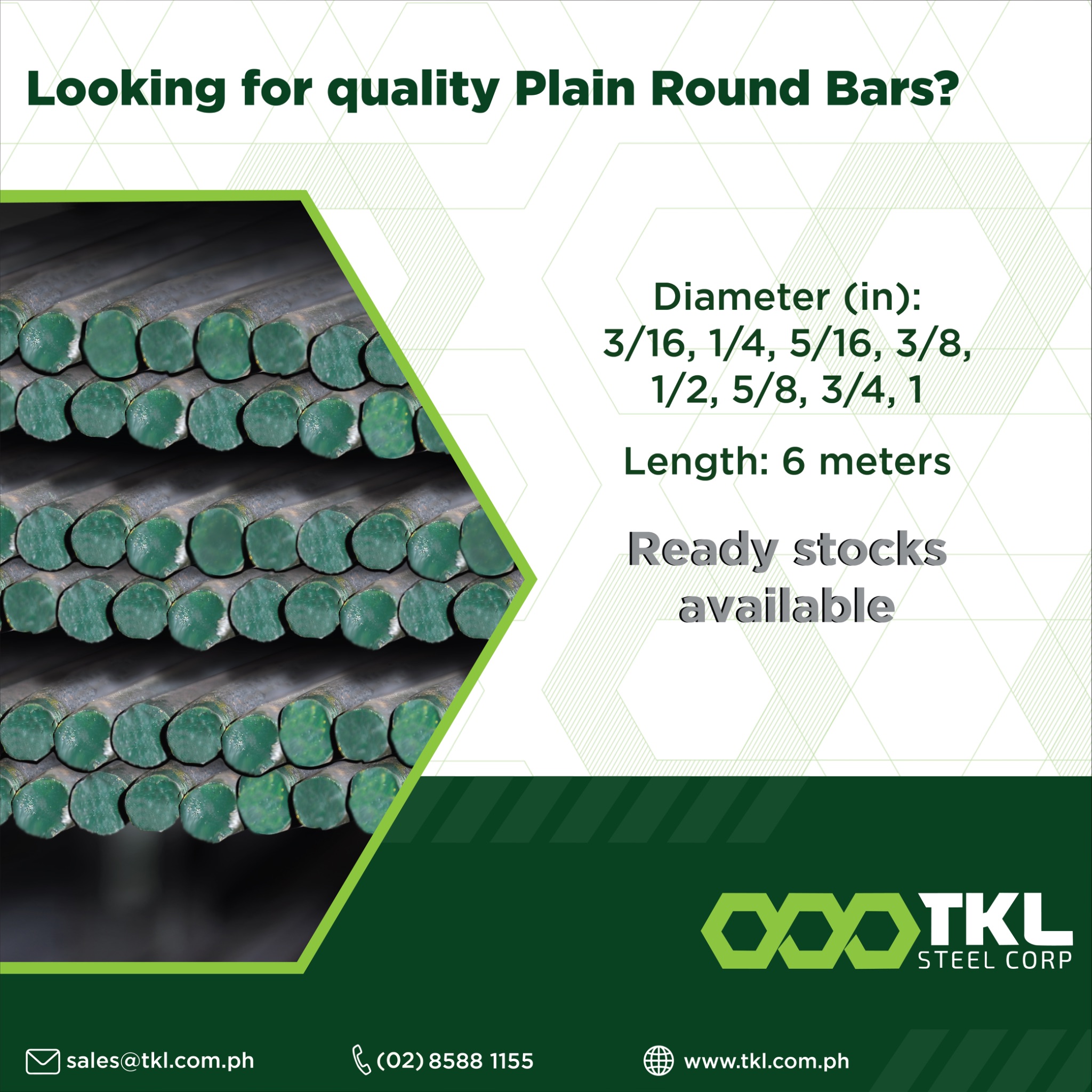 Standard plain round bar sizes in the Philippines typically range from 3/16 inch to 1 inch in diameter and 6 meters in length. These sizes are readily available at TKL Steel, but you can contact us to inquire if you have other size requirements.
